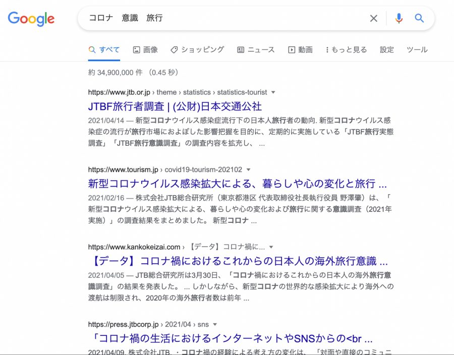 すると、「コロナ」と「意識」という2つに関係する情報を調べることができます。